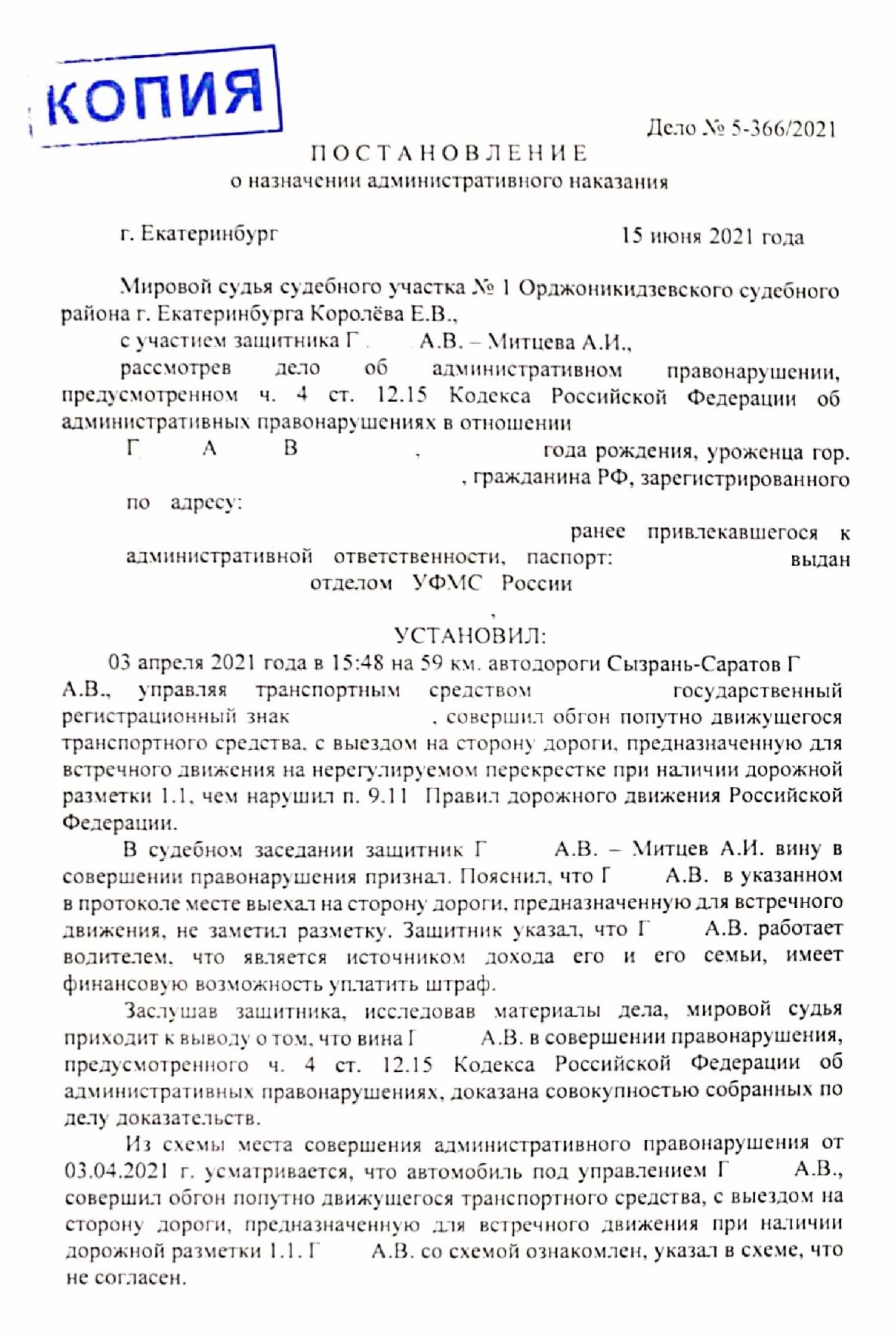 Рассмотрев дело об административном правонарушении, предусмотренном ч.4 ст.12.15 Кодекса РФ об административных нарушениях был назначен штраф 5000 рублей. Права сохранены.