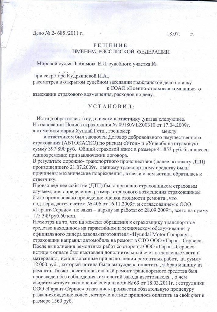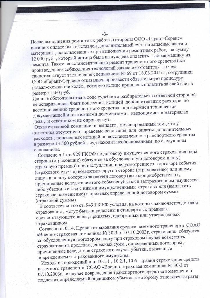 Ремонтные работы были выполнены ООО «Гарант-Сервис», после чего истице был предъявлен дополнительный счет на запасные части и материалы. Истица вынуждена была оплатить выставленную сумму. После этого она подала претензию страховой компании о полном возмещении ущерба, которая осталась без удовлетворения.