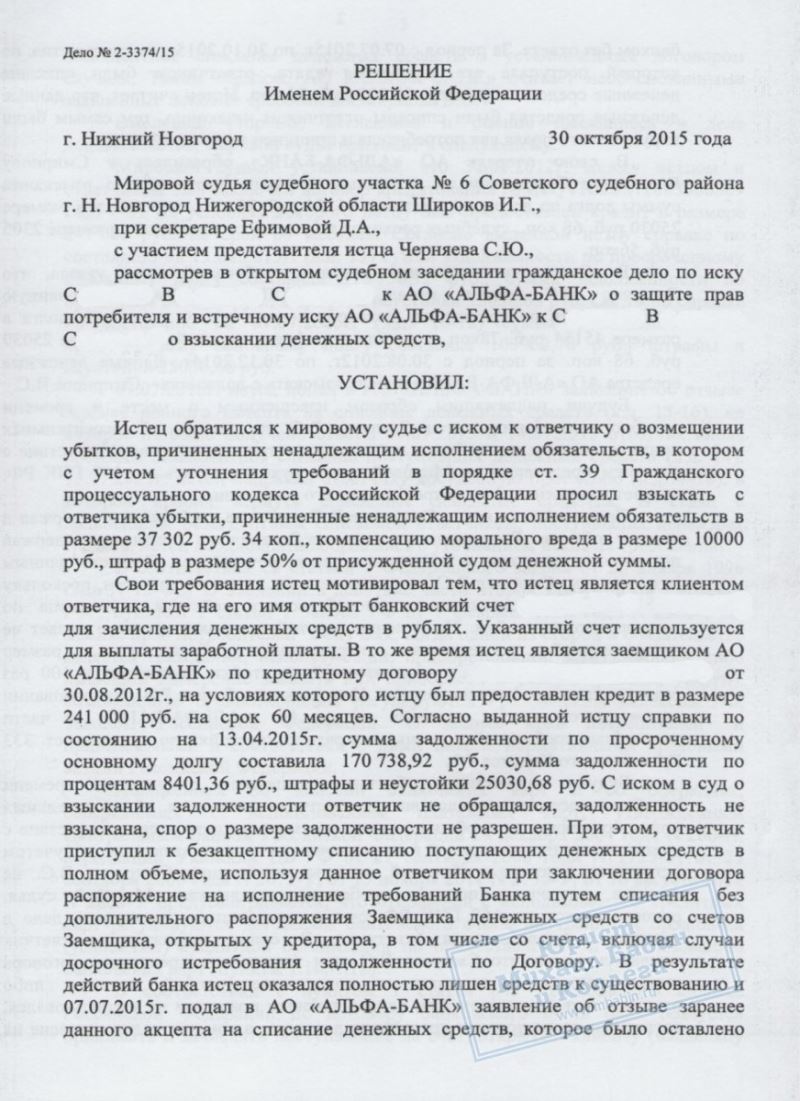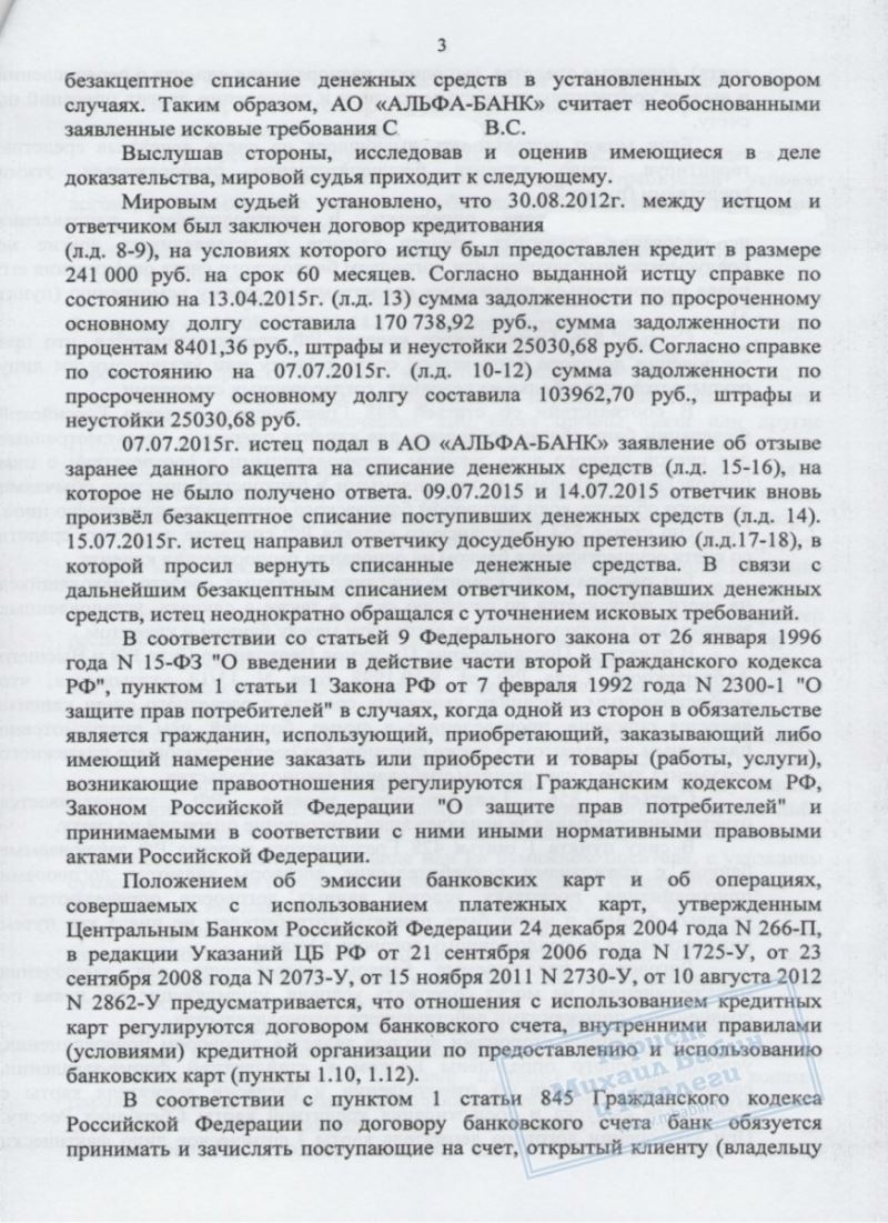 В.С. являлся клиентом банка "Альфа-банк", где он имел расчётный счёт (на который перечислялась его зарплата) и одновременно был заёмщиком. Согласно кредитному договору банк имел право на списание денежных средств со счетов заёмщика без его дополнительного распоряжения. При возникновении просрочки по кредиту банк воспользовался этим правом и стал удерживать поступающие на карту клиента деньги, оставив его при этом без средств к существованию.