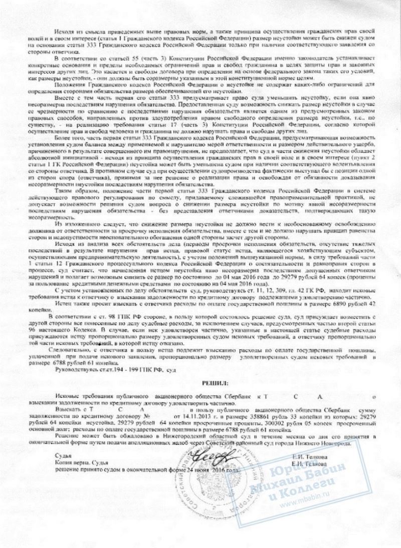 С.Т. обратился за помощью к юристу нашей компании, в связи с просроченным кредитом в банке "Сбербанк". Штрафные санкции банка оказались чрезмерными, на что и указал в суде кредитный юрист. В результате размер неустойки за просроченный кредит был уменьшен судом на 10 000 рублей.