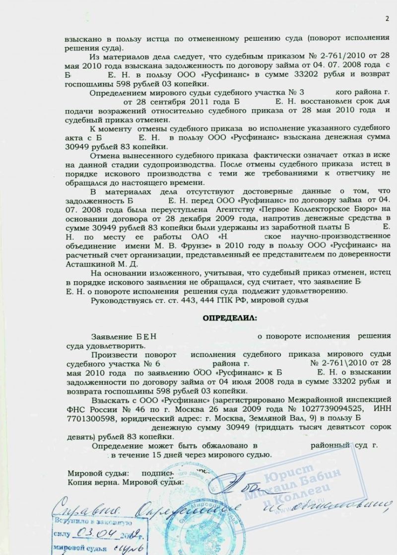 Банк ООО «Русфинанс» удерживал часть заработной платы заемщика Е.Н. в счет погашения ее долга. К моменту обращения Е.Н. к юристу с нее была таким образом взыскана 31.000 руб. (сумма округлена).