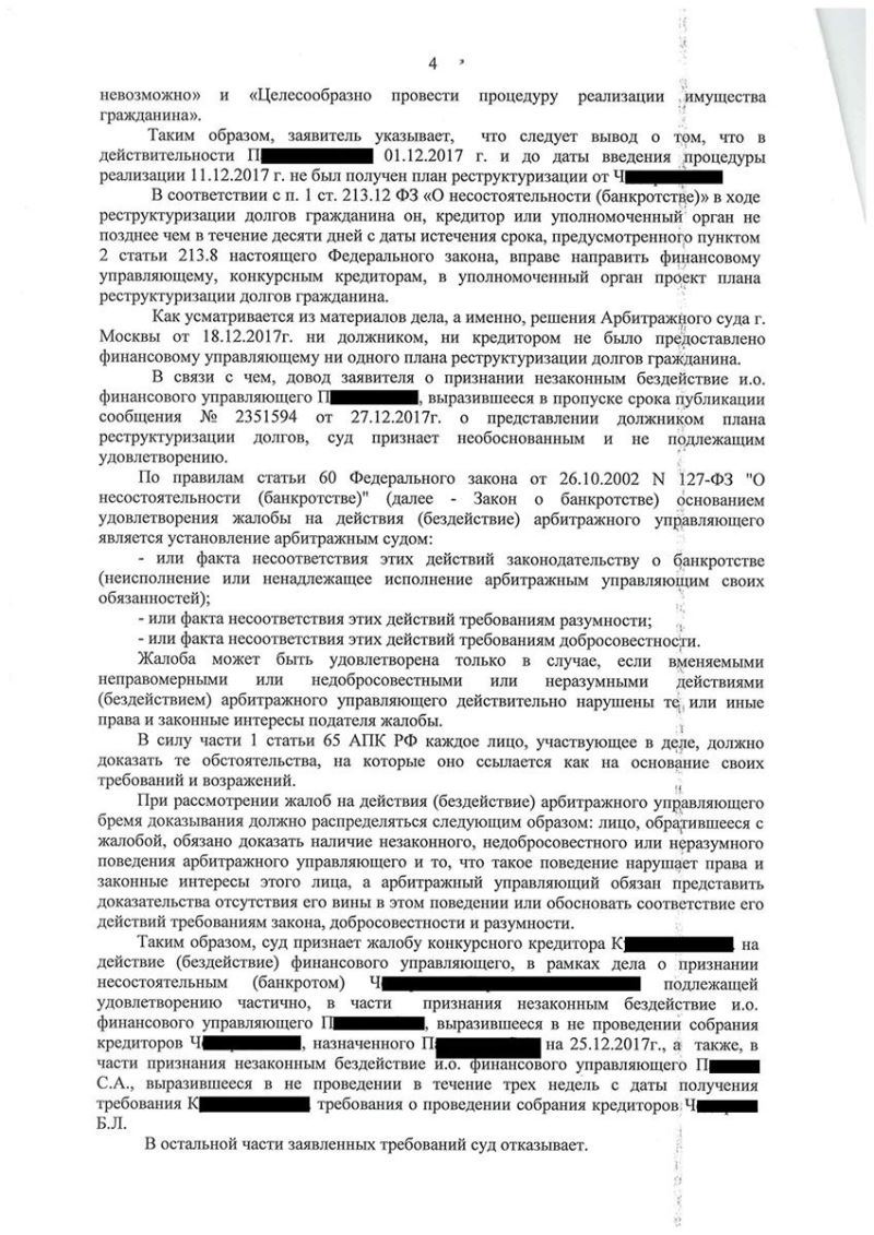 Адвокат разъяснил клиенту, что собрание кредиторов, может быть проведено также и по требованию конкурсного кредитора, чьи требования составляют не менее 10% от суммы всех остальных, включенных в реестр. В дальнейшем адвокат направил финансовому управляющему соответствующее требование, а когда последний уклонился от проведения собрания кредиторов – зафиксировал данное нарушение и обратился с жалобой в Арбитражный суд г. Москвы.