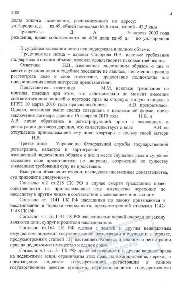 Договор между умершим и его матерью Н.В. о дарении его доли в квартире истица требовала признать незаключенным. Интересы ответчика Н.В. представлял руководитель компании, который исковые требования не признал.