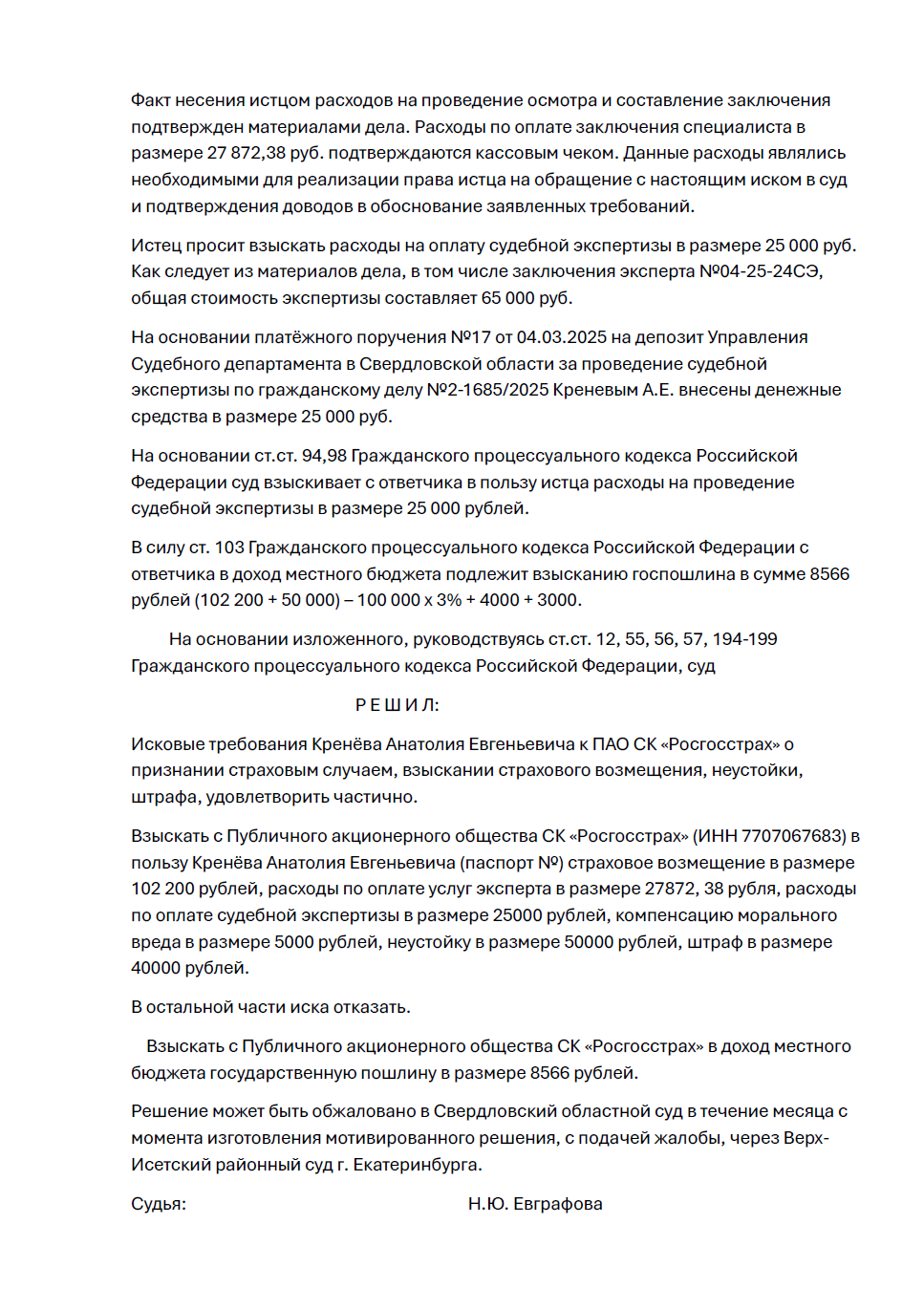 Суд полностью удовлетворил наши требования, признав случай страховым и взыскав с ПАО СК «Росгосстрах» в пользу клиента: