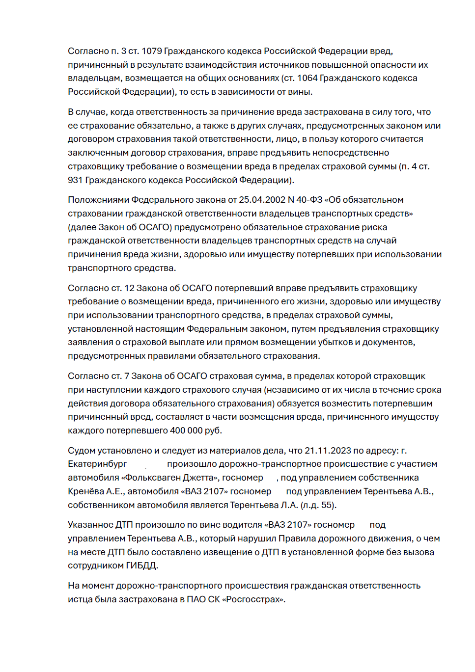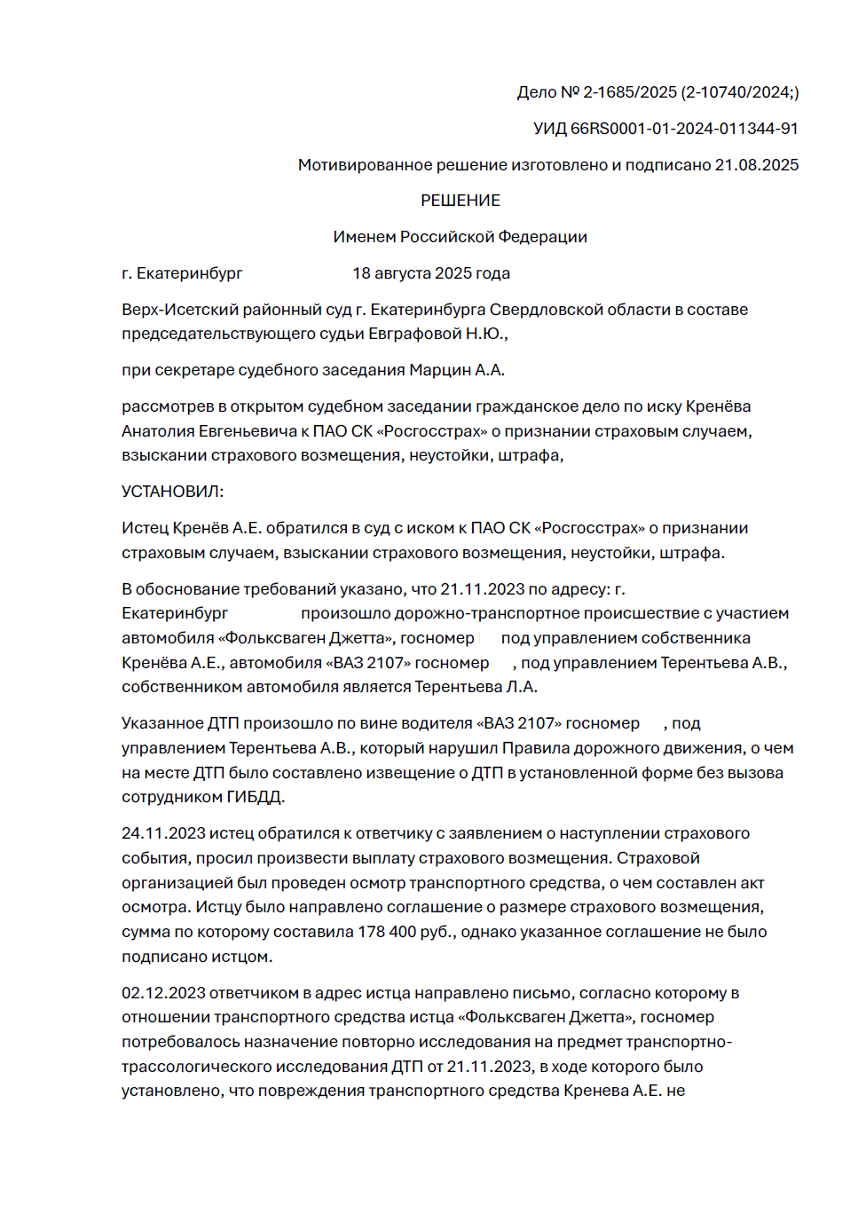 Наш клиент, владелец автомобиля Volkswagen, стал участником ДТП в Екатеринбурге. Виновником аварии был признан водитель другого автомобиля, о чем стороны составили европротокол. Несмотря на это, страховая компания виновника — ПАО СК «Росгосстрах» — после проведения собственного трассологического исследования заявила, что повреждения на автомобиле клиента не связаны с заявленным ДТП, и отказала в выплате. Клиенту было предложено подписать соглашение на сумму 178 400 рублей (без учета износа), но, не согласившись с выводами страховщика, он обратился за юридической помощью.