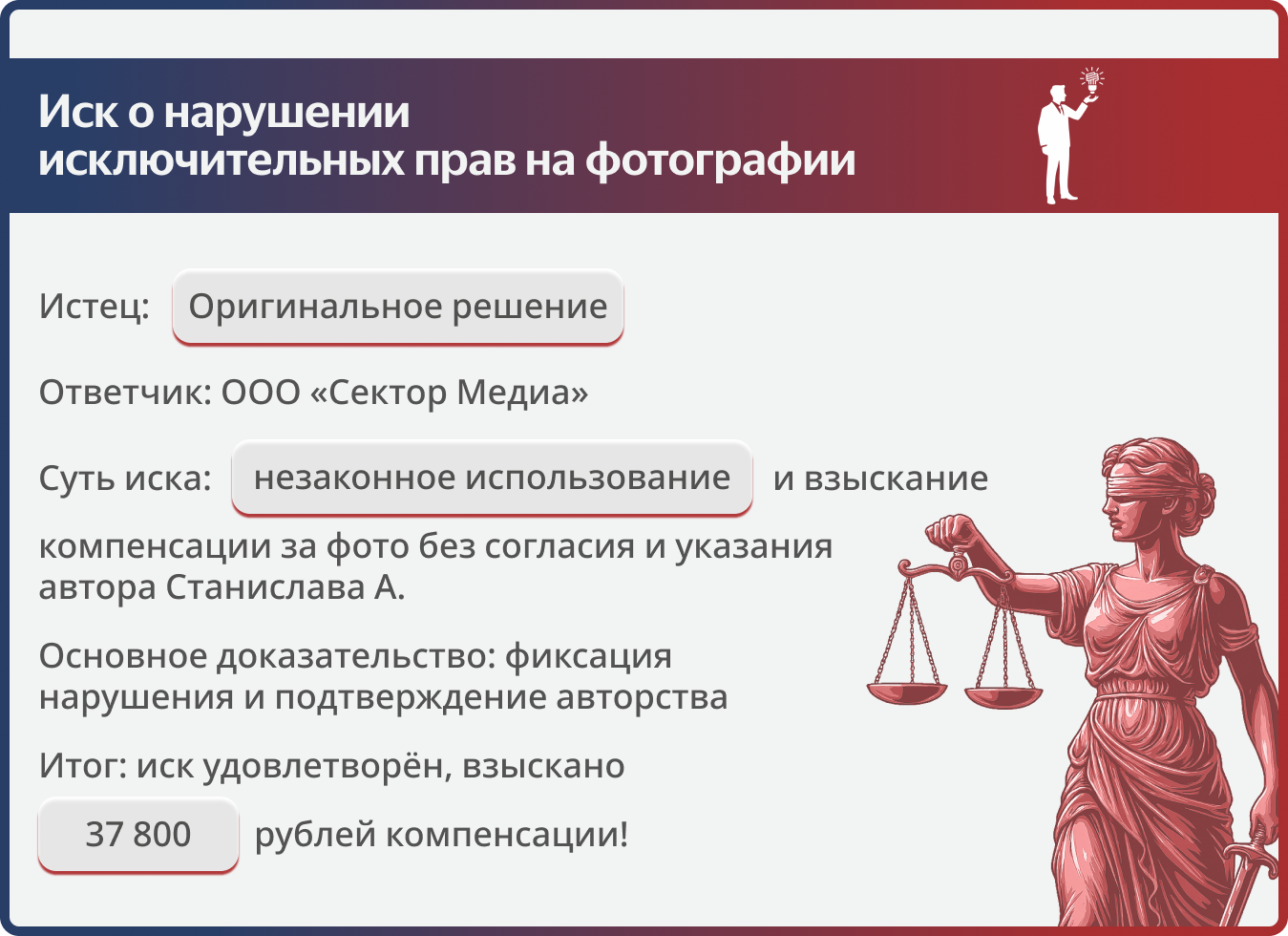 • Запрет на использование: ответчик обязался прекратить использование фото и уничтожить все копии на материальных и электронных носителях.
