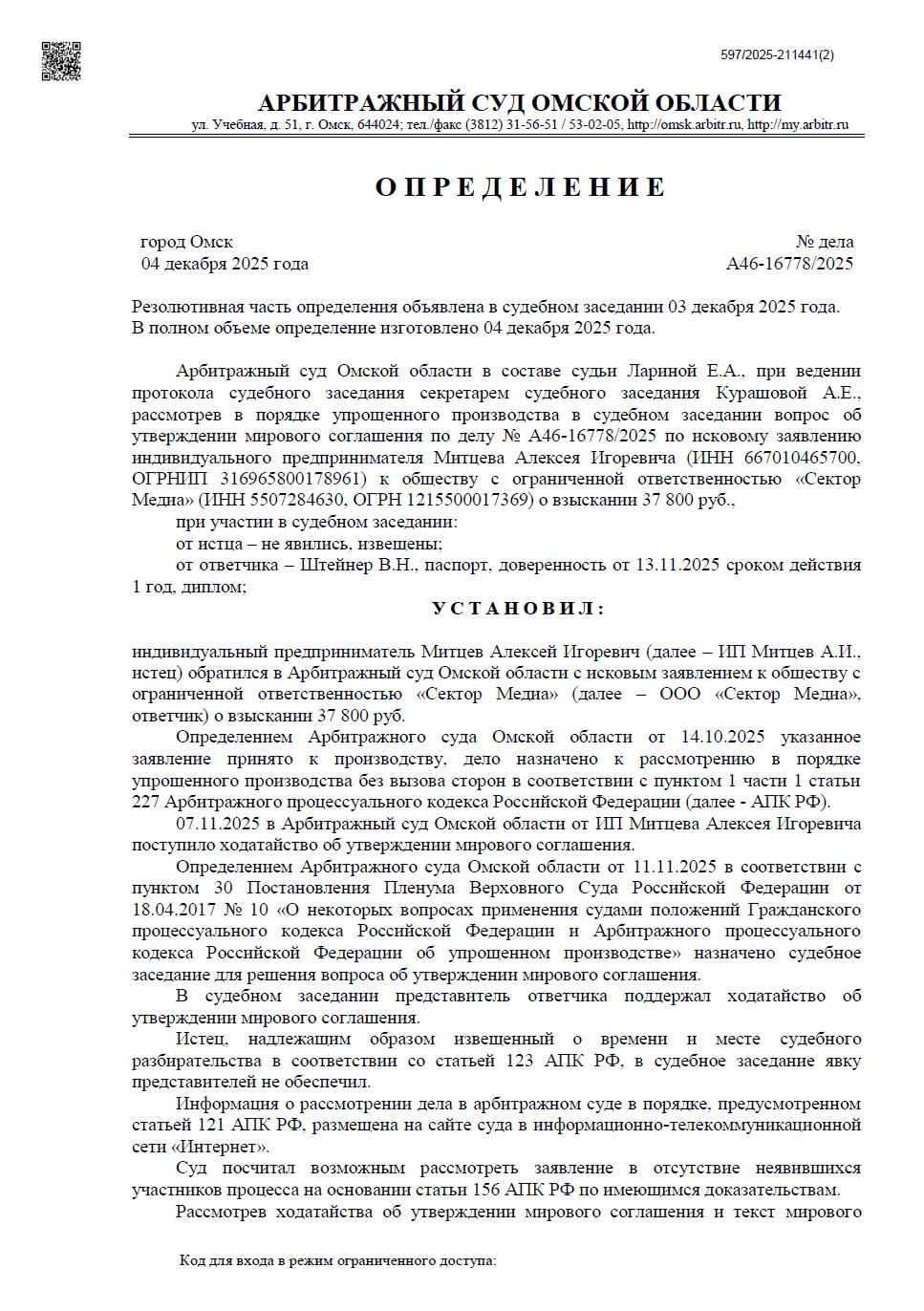 Специалисты нашей компании обратились в Арбитражный суд Омской области с исковым заявлением к ООО «Сектор Медиа». Основанием стал факт неправомерного использования фотографии. Суд принял дело к рассмотрению в порядке упрощенного производства.