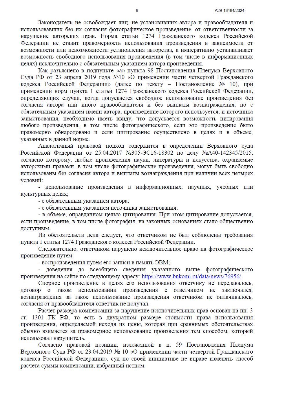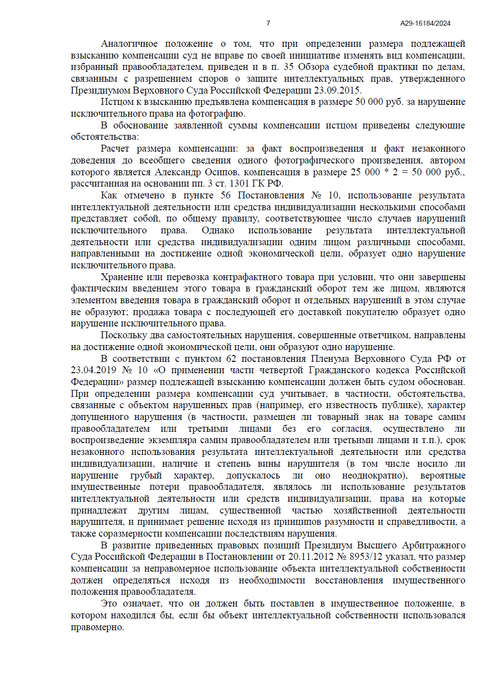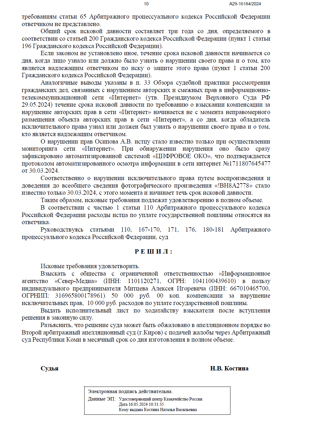 Арбитражный суд Республики Коми полностью удовлетворил наши требования. Суд признал, что использование фотографии без указания имени автора (Осипова А.В.) не может быть признано свободным цитированием, а срок исковой давности не пропущен.