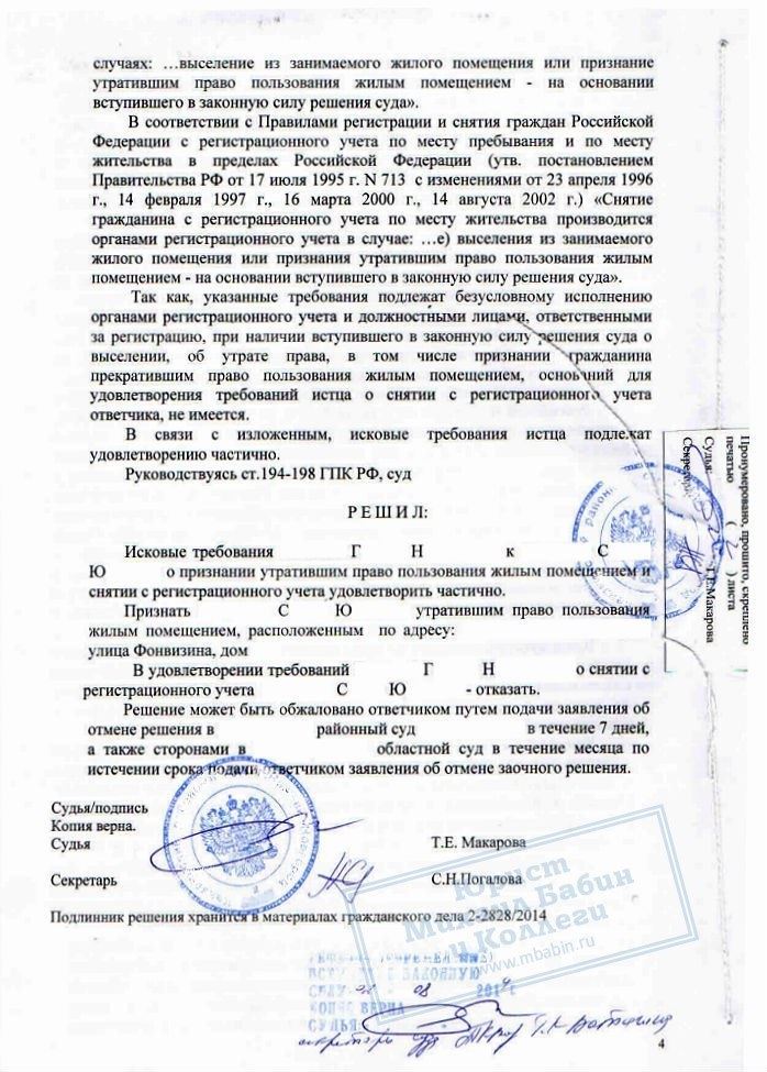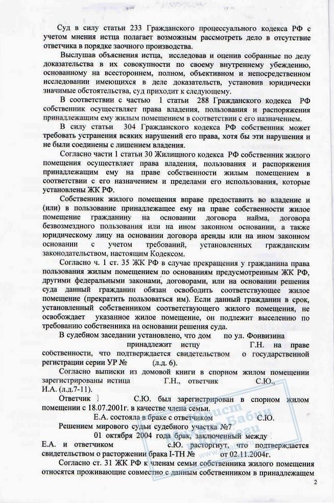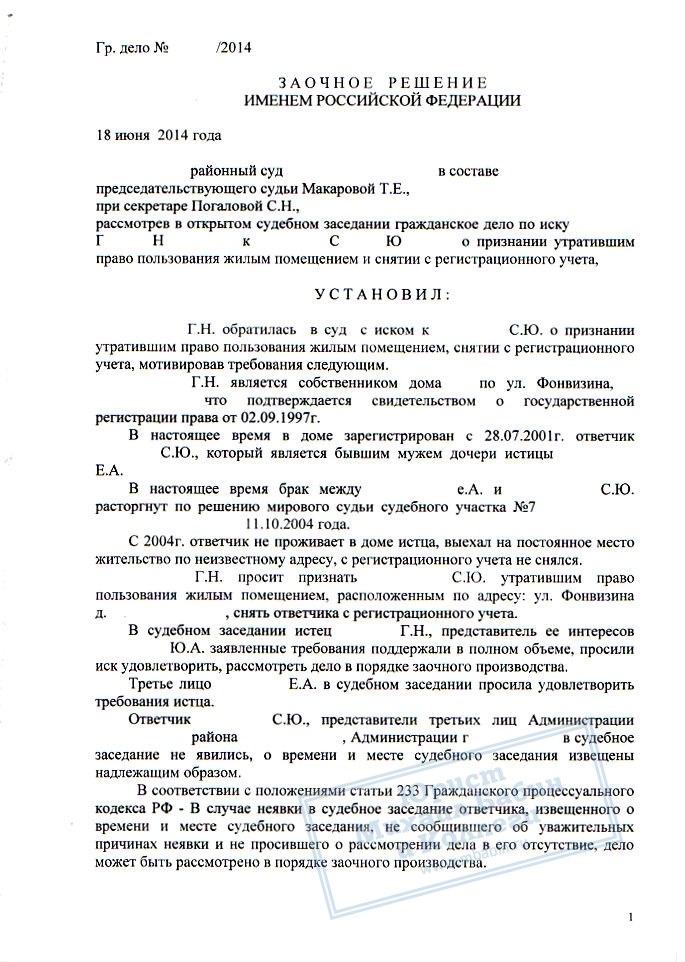В нашу компанию обратилась гражданка Г.Н., бывший муж которой не выписывался из квартиры, несмотря на ее многочисленные просьбы. С помощью юриста Г.Н. обратилась в суд. Ее бывший супруг был признан прекратившим право пользования квартирой и выписан по решению суда.