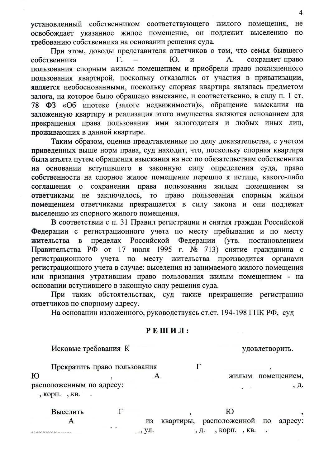Учитывая все материалы дела, заслушав представителей истицы и ответчика, при участии прокурора, судья принял решение об удовлетворении исковых требований – прекращении права пользования жилым помещением, выселении ответчика и членов его семьи и снятии с регистрационного учета по данному адресу.