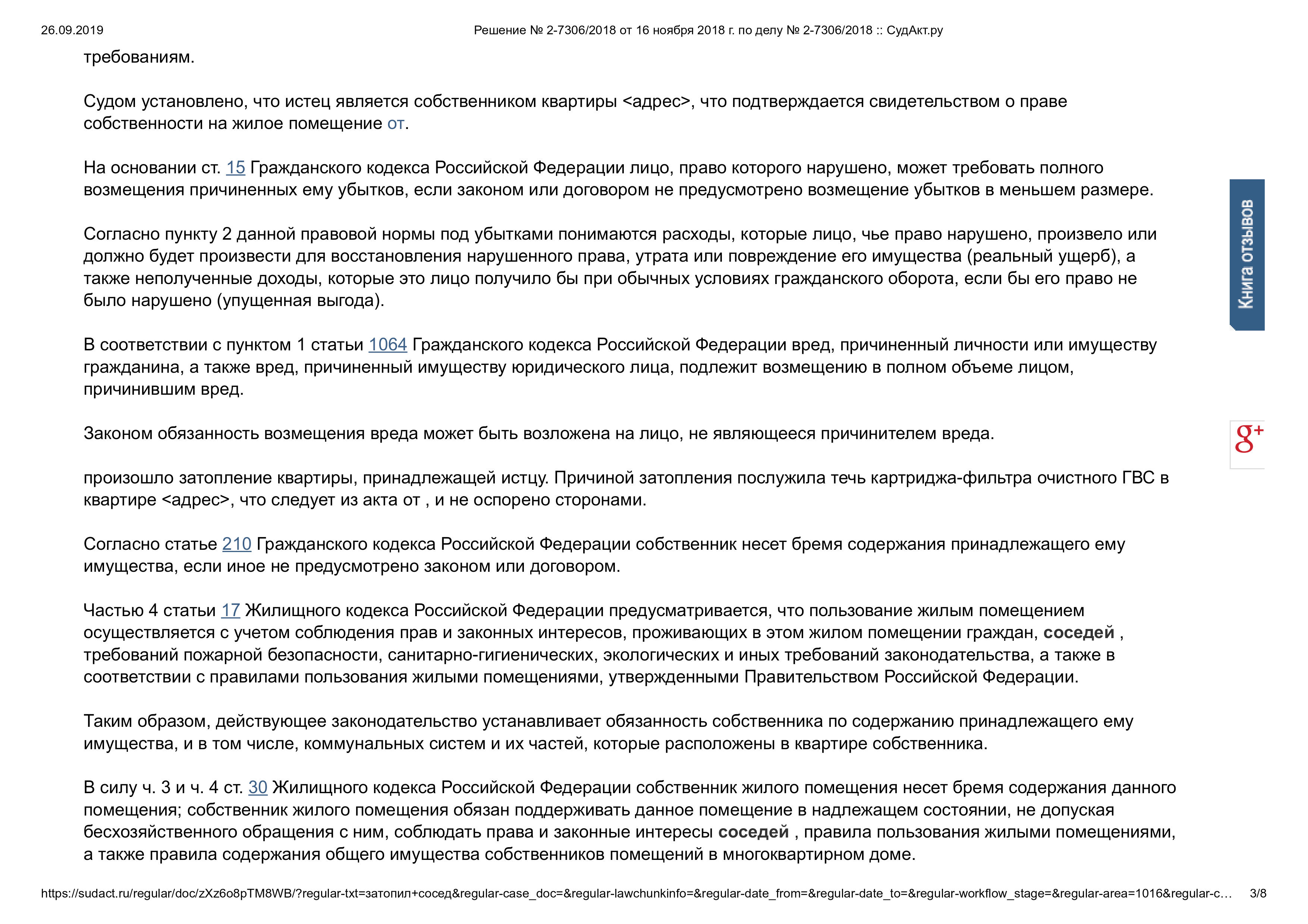 Возместить ущерб, причиненного заливом жилого помещения